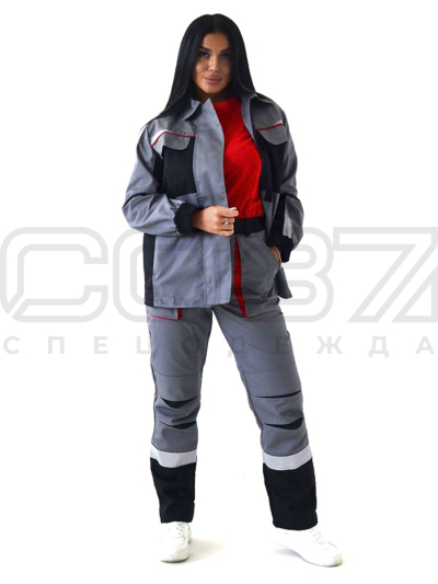 Костюм рабочий женский "Кейп" с СОП цв.серый/чёрный/красный тк.смесовая (куртка+брюки) в Перми